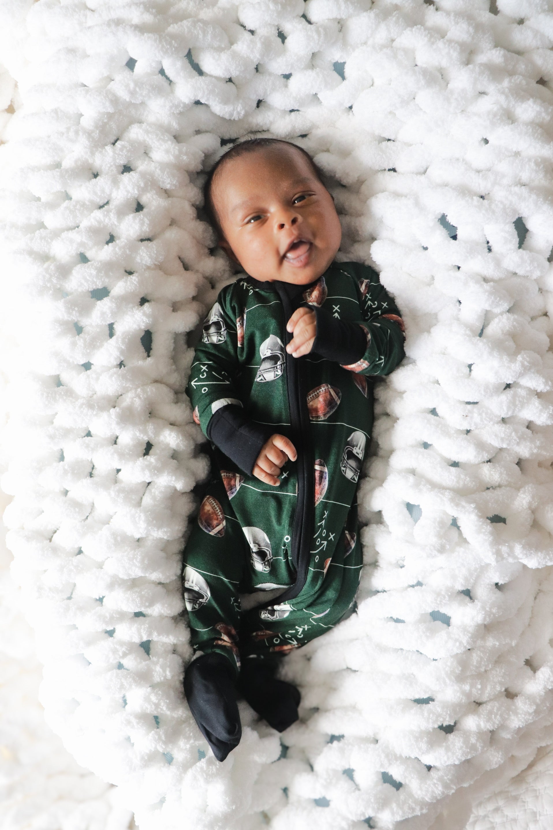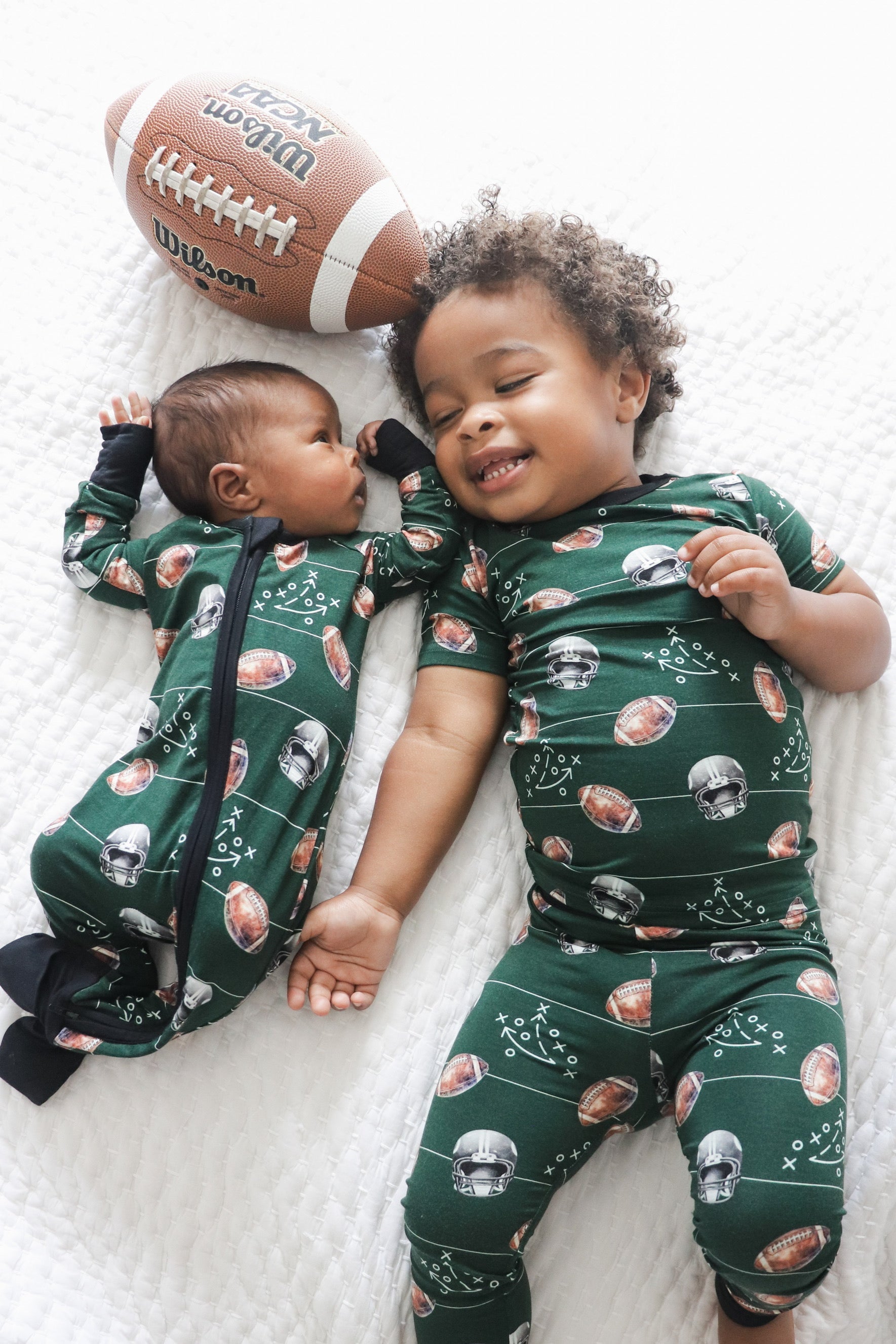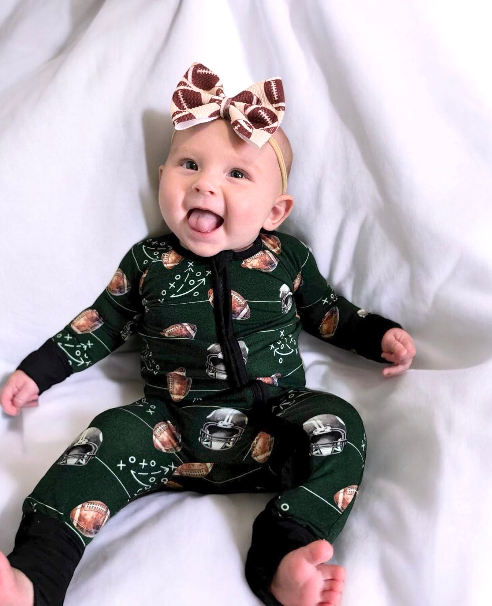 This print features watercolor footballs, helmets, and plays on a grassy field. This one is a touchdown!