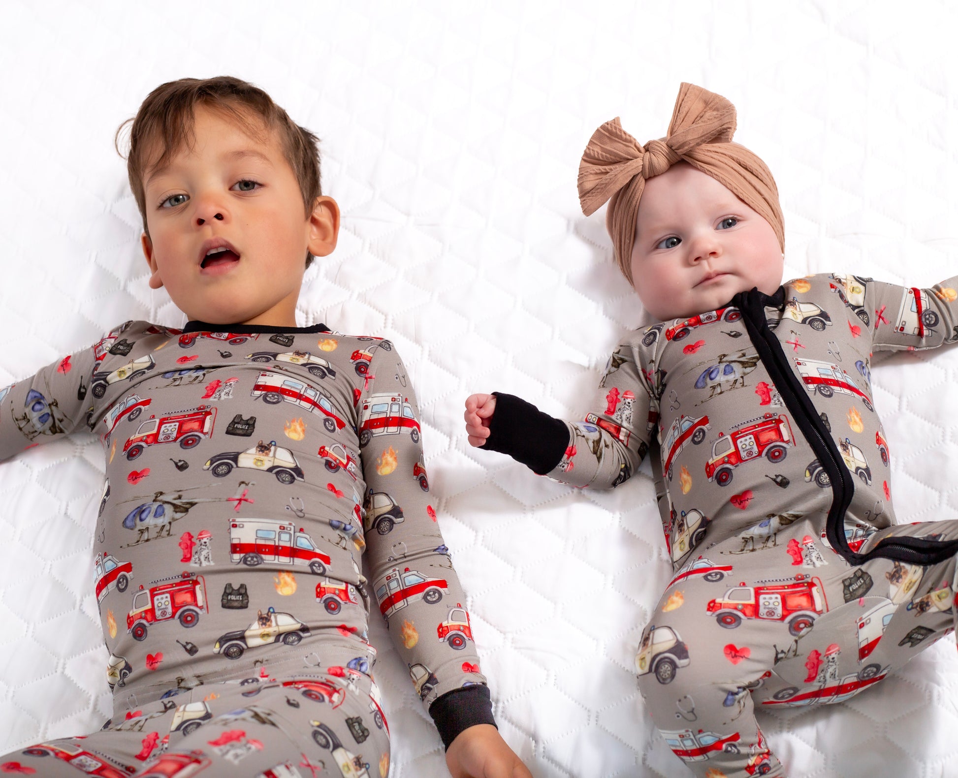 These first responders (and their canine companions) are ready to respond! The print features fire trucks, police cars, ambulances, and a helicopter on gray. These are the perfect thickness for buttery soft jammies.