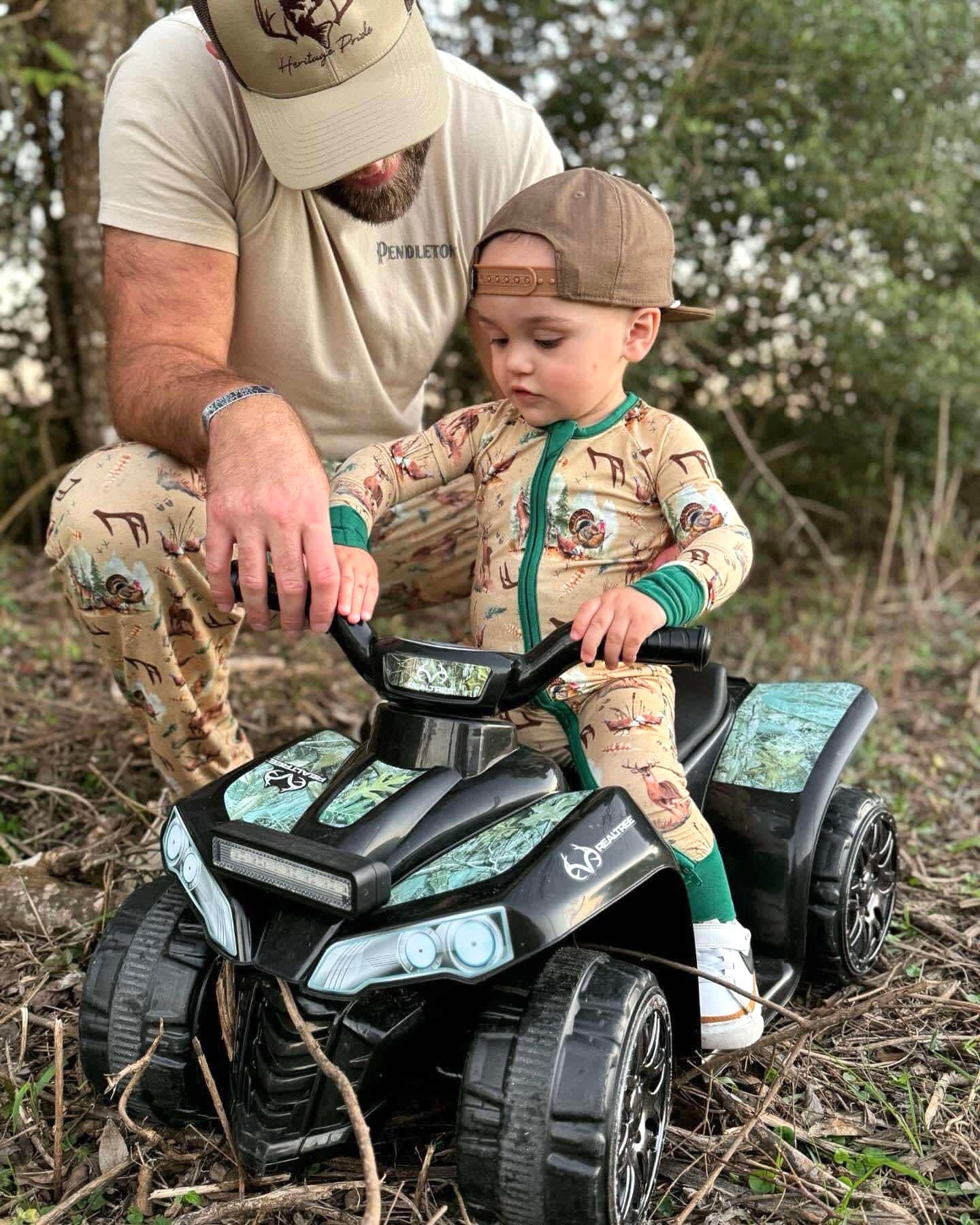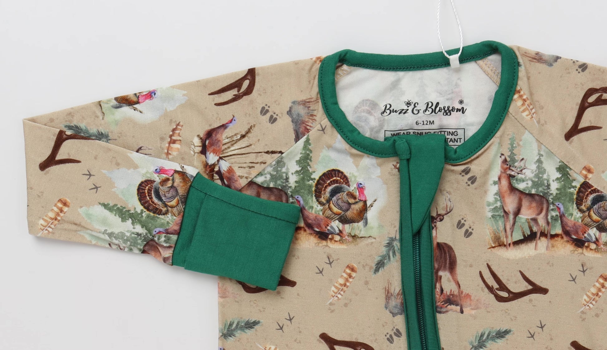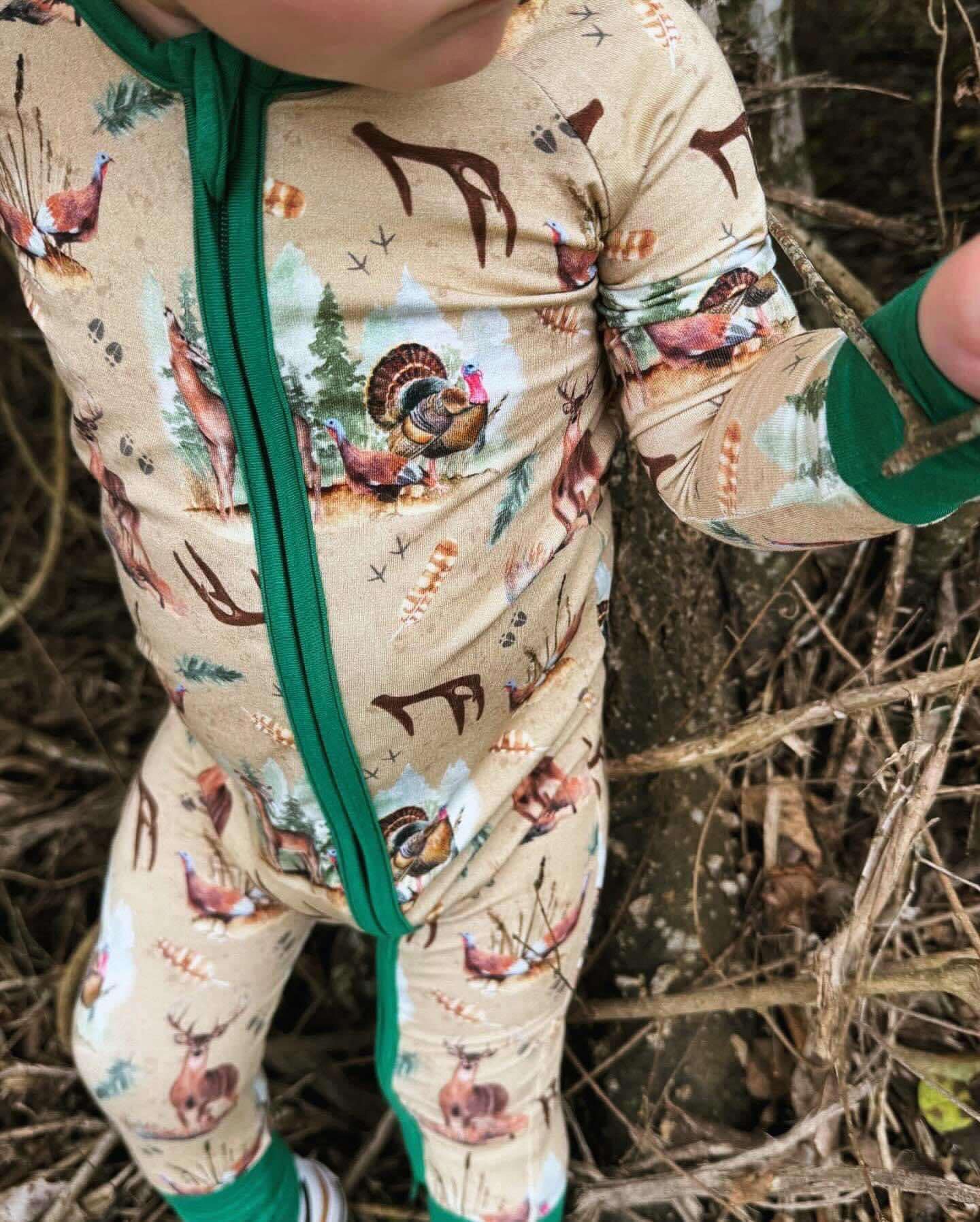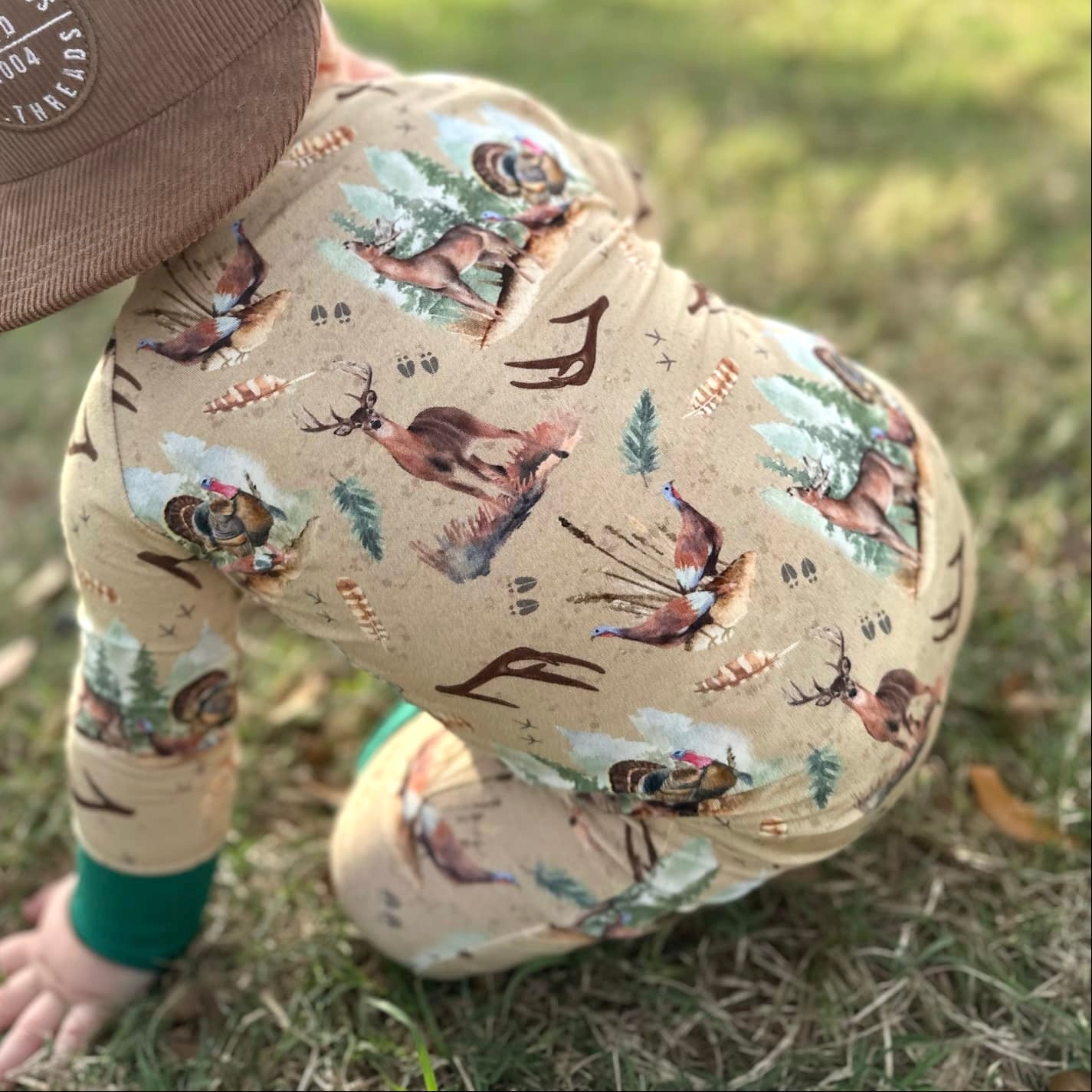 This print features deer and turkey in the wild. The beautiful and vibrant print is perfect for any hunters or nature lovers! The perfect thickness for buttery soft jammies! Perfect family matching for the outdoor lovers!