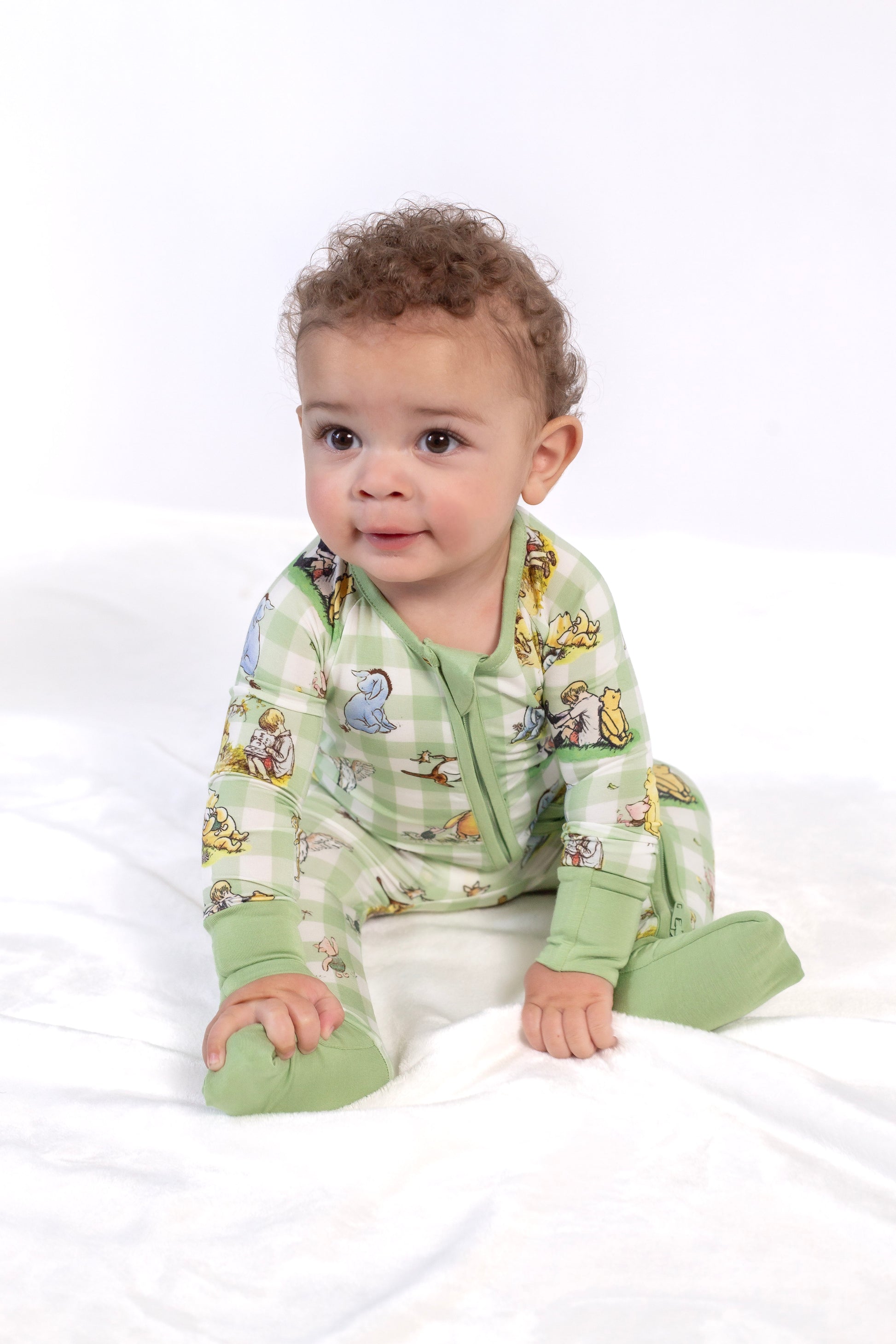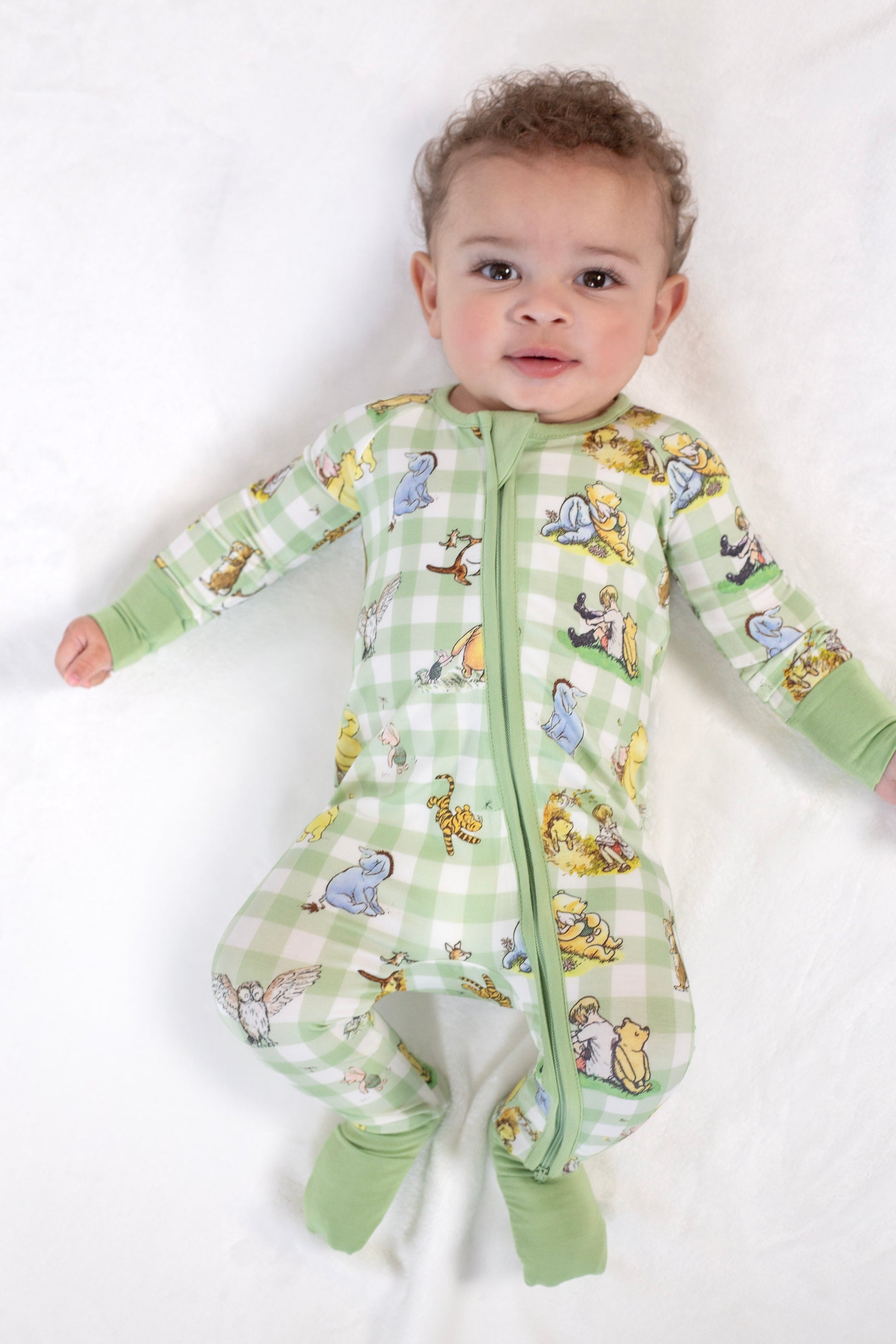 Our Vintage Pooh print is a whimsical flashback to childhood! Featuring the classic pooh characters from the original 1926 book on a sage plaid, this print is an instant favorite! Our bamboo is the perfect thickness for both stretch and comfort.