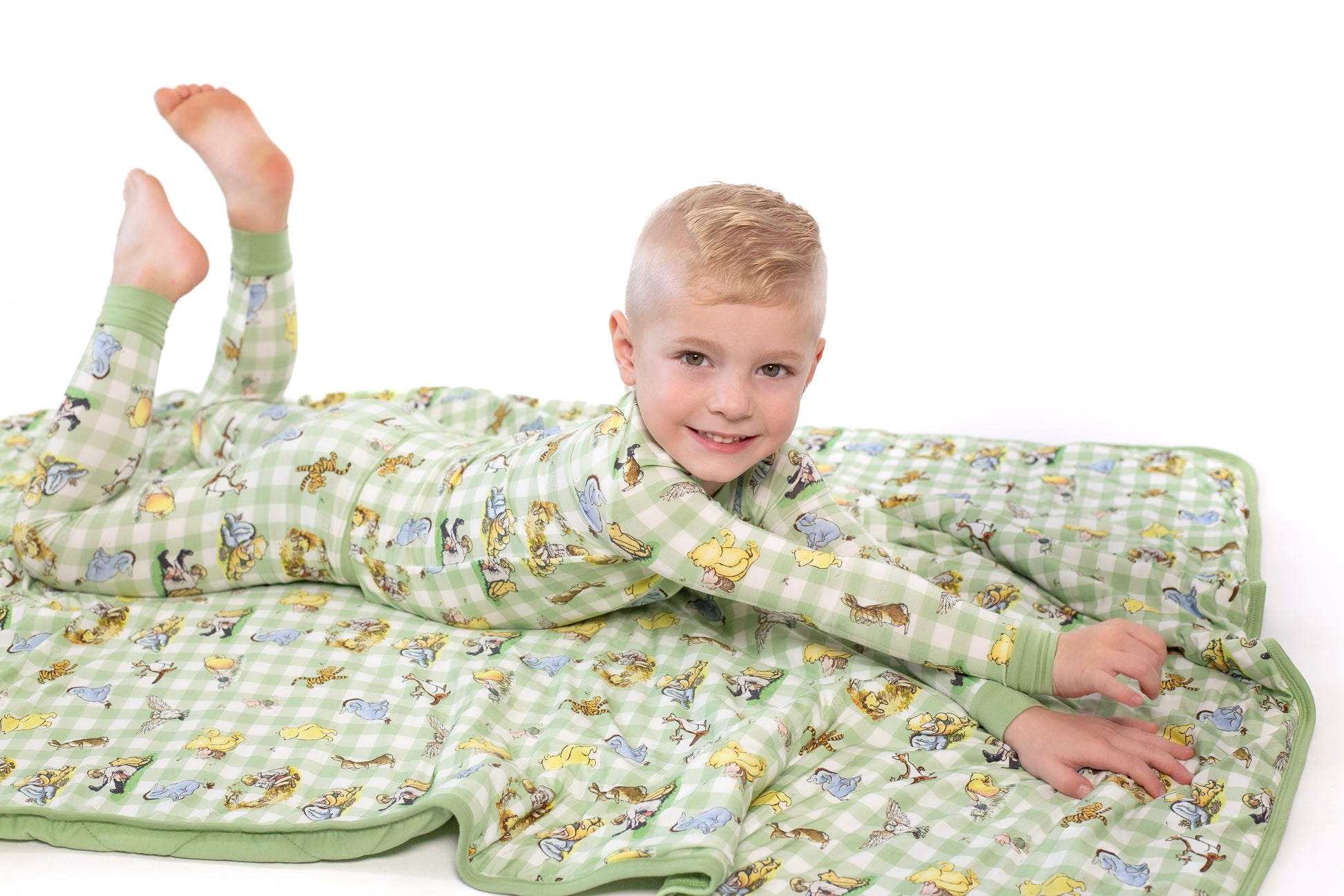 Our Vintage Pooh print is a whimsical flashback to childhood! Featuring the classic pooh characters from the original 1926 book on a sage plaid, this print is an instant favorite! Our bamboo is the perfect thickness for both stretch and comfort.